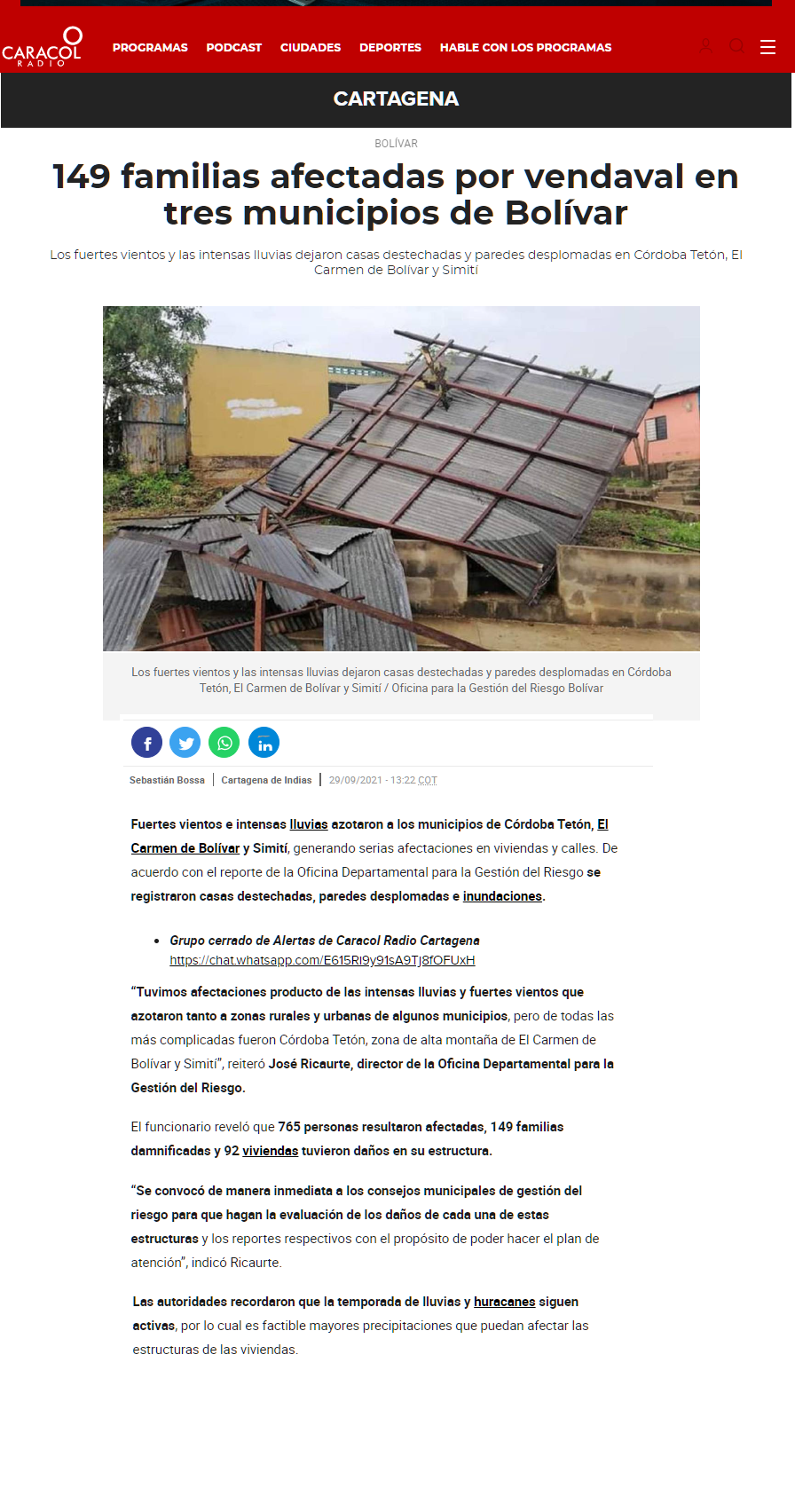 Mostrar el registro completo del ítem149 familias afectadas por vendaval en tres municipios de Bolívar